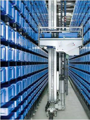 料箱库是以料箱为存储单元,通过提取车实现料箱在货架上的存放工作,货叉将料箱送到生产线上。